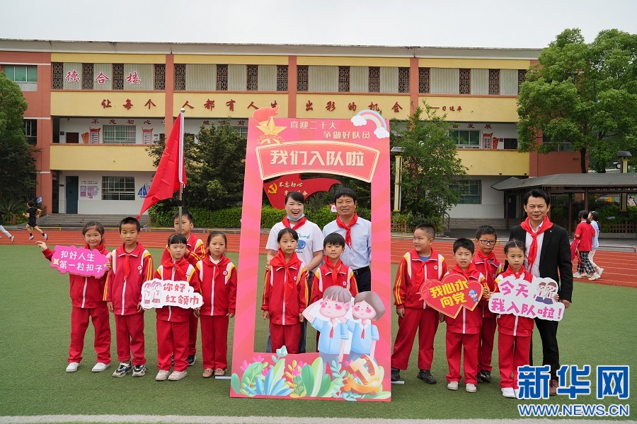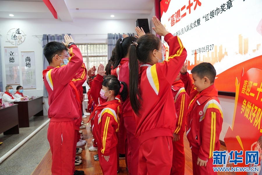 在江西省萍乡市芦溪县源南学校,孩子们戴上红领巾,光荣加入中国少年先锋队。新华网发 王强摄