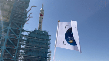 ↑5月29日,神舟十四号载人飞船与长征二号F遥十四运载火箭组合体准备转往发射区。(汪江波 摄)