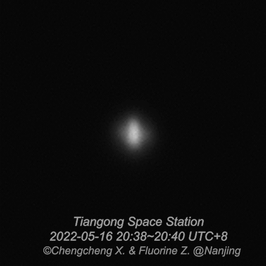 ↑5月16日,中国空间站过境南京,天舟四号与核心舱、天舟三号组成“一”字构型。(徐成城、朱一静 提供)