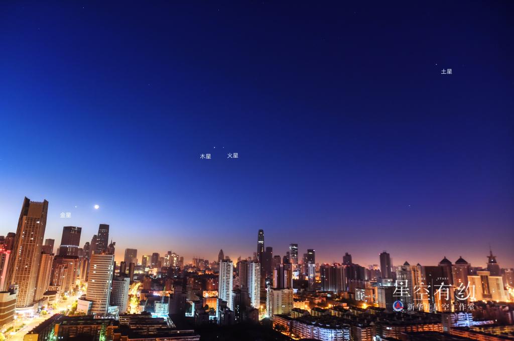这是天津市天文爱好者杨婧2022年5月27日凌晨在天津拍摄的金星、木星、火星和土星。(本人供图)