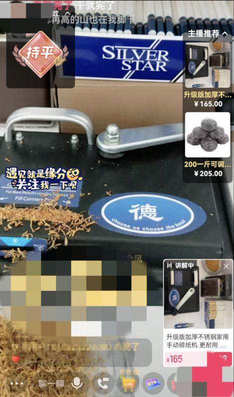 有的直播间小黄车里虽然显示只有“碎纸机”“粉笔管”,但当记者询问有无烟丝和如何购买时,有的主播说:“有!想要可以加微信私聊。”
