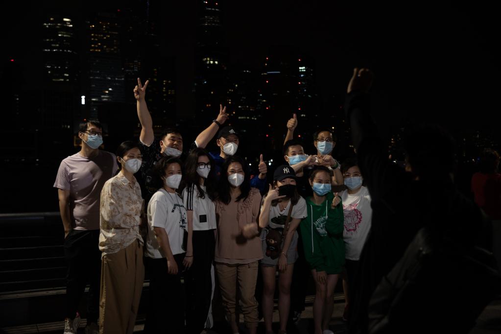 大家或拍照留念,或悠闲散步,有人飞起无人机航拍,还有人朝着对岸陆家嘴方向欢呼。