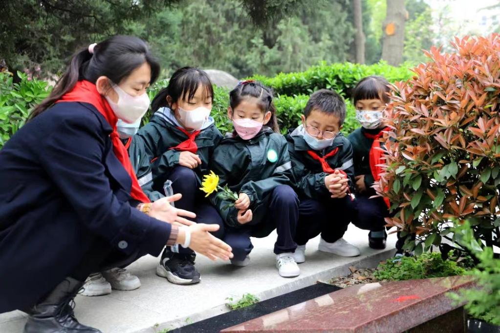 窦晨和孩子们在烈士陵园缅怀先烈。(图片由受访者提供)