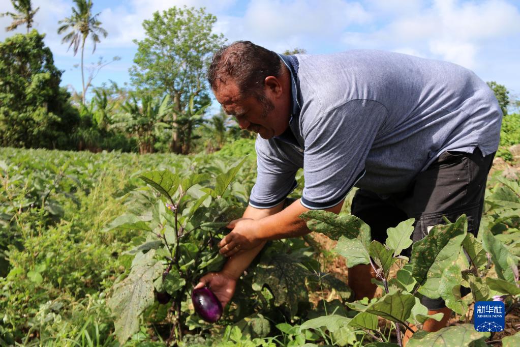 2019年10月20日,在萨摩亚阿雷沙村,农场主约翰·马普苏在农田中查看中国品种茄子的长势。中国农业专家扎根萨摩亚,通过示范与培训提升当地农业生产水平,不仅提高了农民的收入,更丰富了当地人的“果菜篮子”。