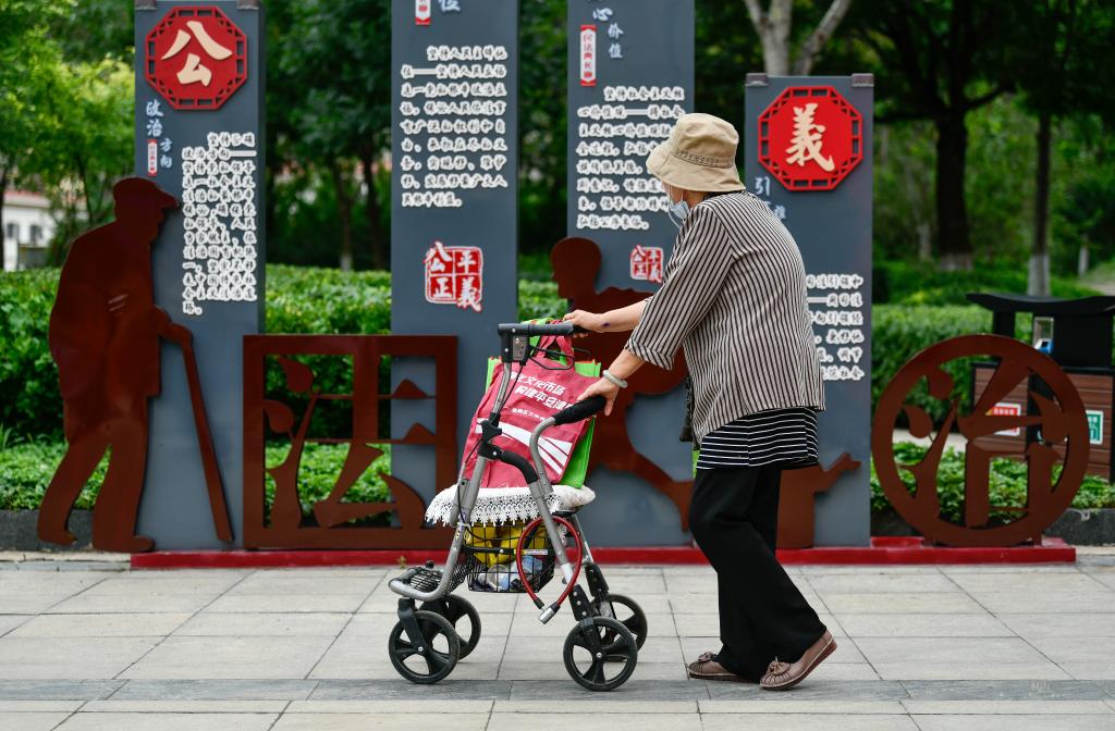 市民走过天津市津南区海河故道公园民法典主题长廊一角。新华社记者 孙凡越 摄