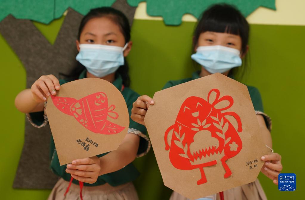 6月2日,青山湖学校的学生展示自己制作的端午主题剪纸作品。