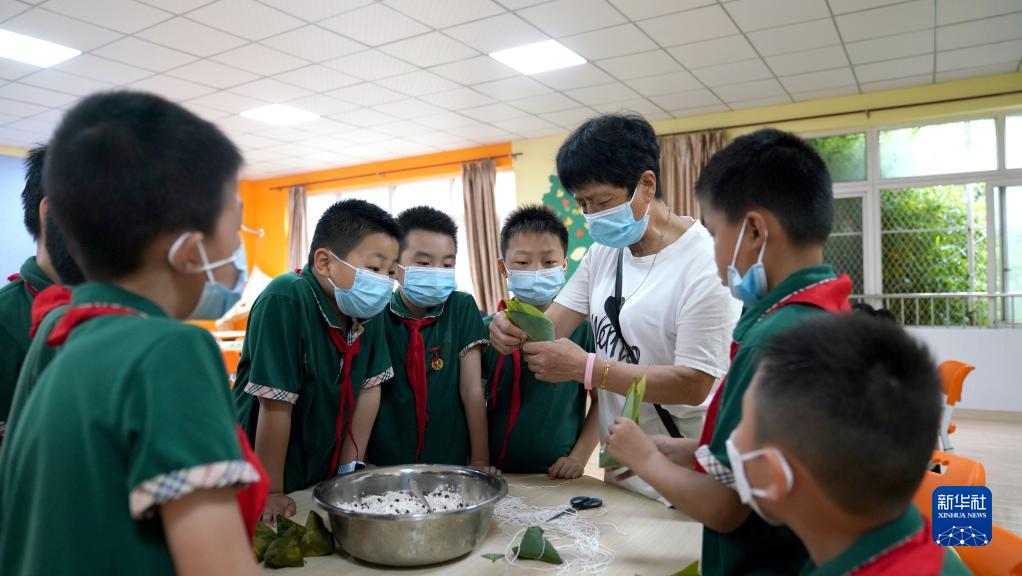 6月2日,社区工作人员教青山湖学校学生包粽子。