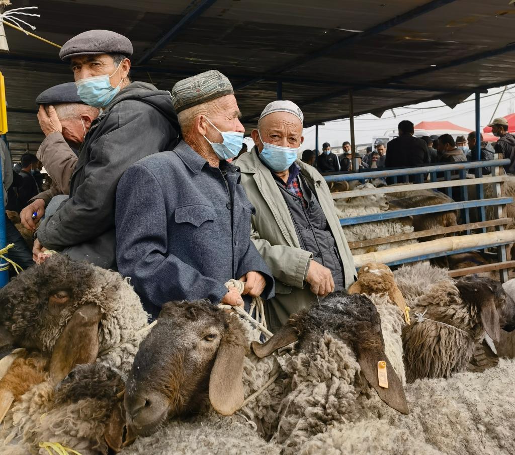 走进“牛羊巴扎”,满眼是穿梭的牛羊与人群。道路两旁,羊儿三五成群,牛儿自由自在甩着尾巴。