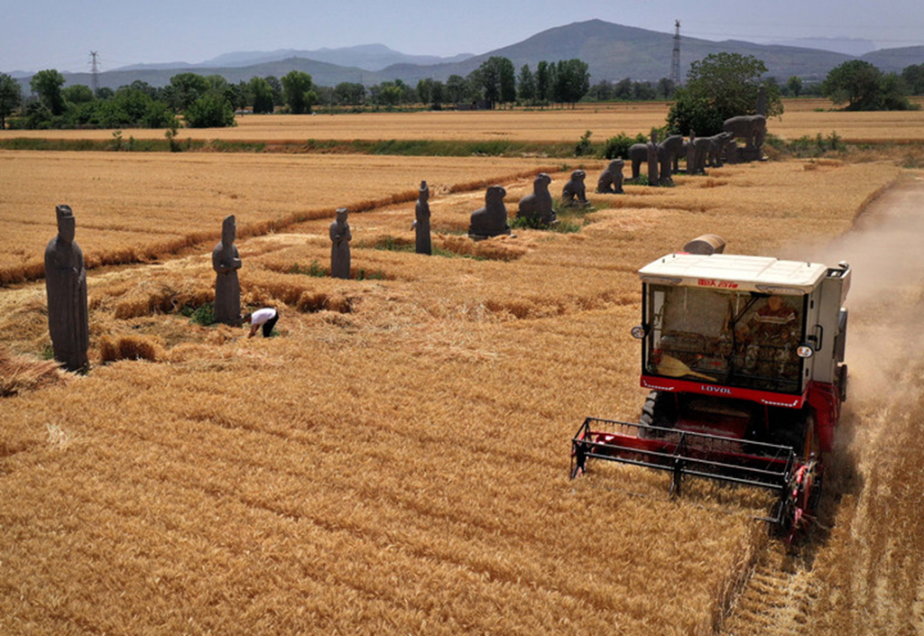 图为6月1日工作人员在河南省巩义市使用镰刀和收割机收割永泰陵内石像生周边及外围的小麦(无人机照片)。 新华社记者 李安 摄