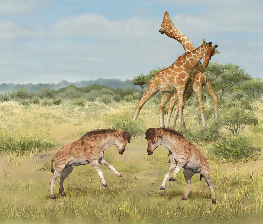 可以推测这样的情况:约在700万年前,东非高原由森林环境转变为开阔的草原,远古长颈鹿赖以生存的环境逐渐消失,促使它们必须适应新的变化。本来身体比较高大的长颈鹿,可能在这个时期发展出了利用甩动脖子和头部攻击竞争对手的方式。通过这种极端的斗争方式,在性选择的加持下,在200万年的时间内长颈鹿的颈部迅速加长,成为现生的长颈鹿属,从而有效占领了取食高处树叶这样一个相对边缘化、但回报颇丰的生态位。