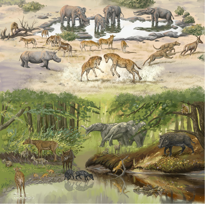 准噶尔盆地约1700万年前的动物群,正中间为獬豸盘角鹿。(郭肖聪复原,中科院古脊椎所供图)
