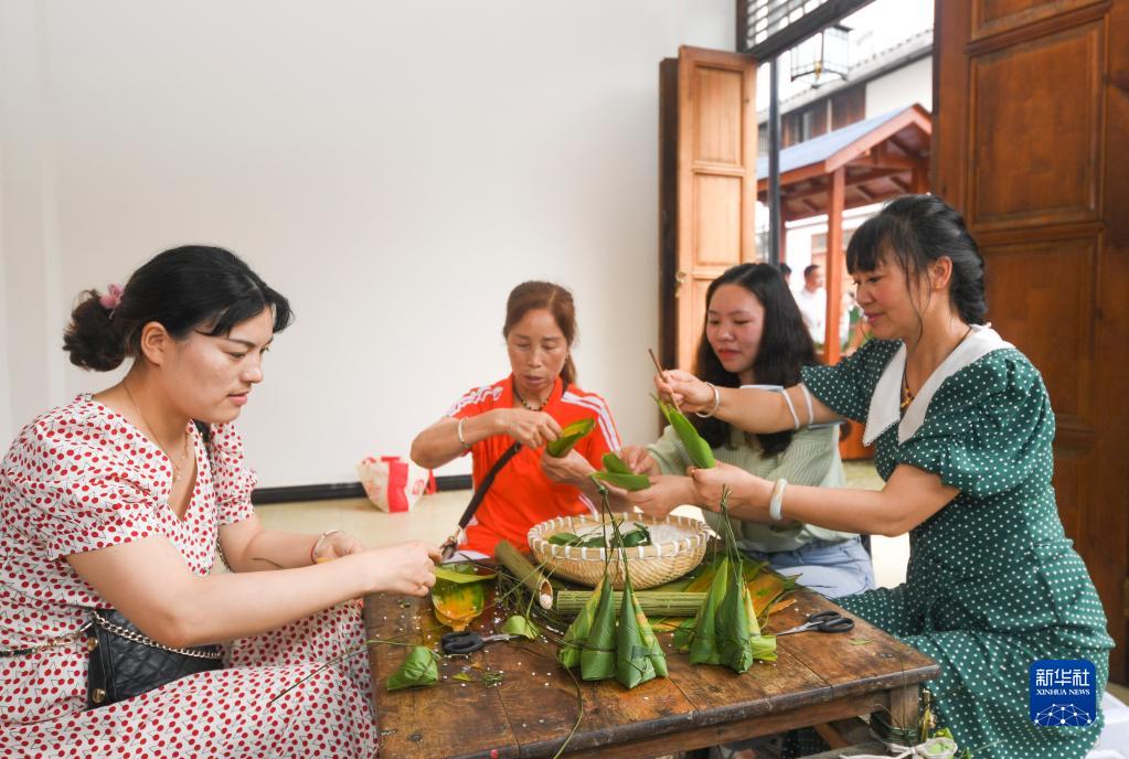 6月3日,游客在重庆市永川区板桥老街体验包粽子。
