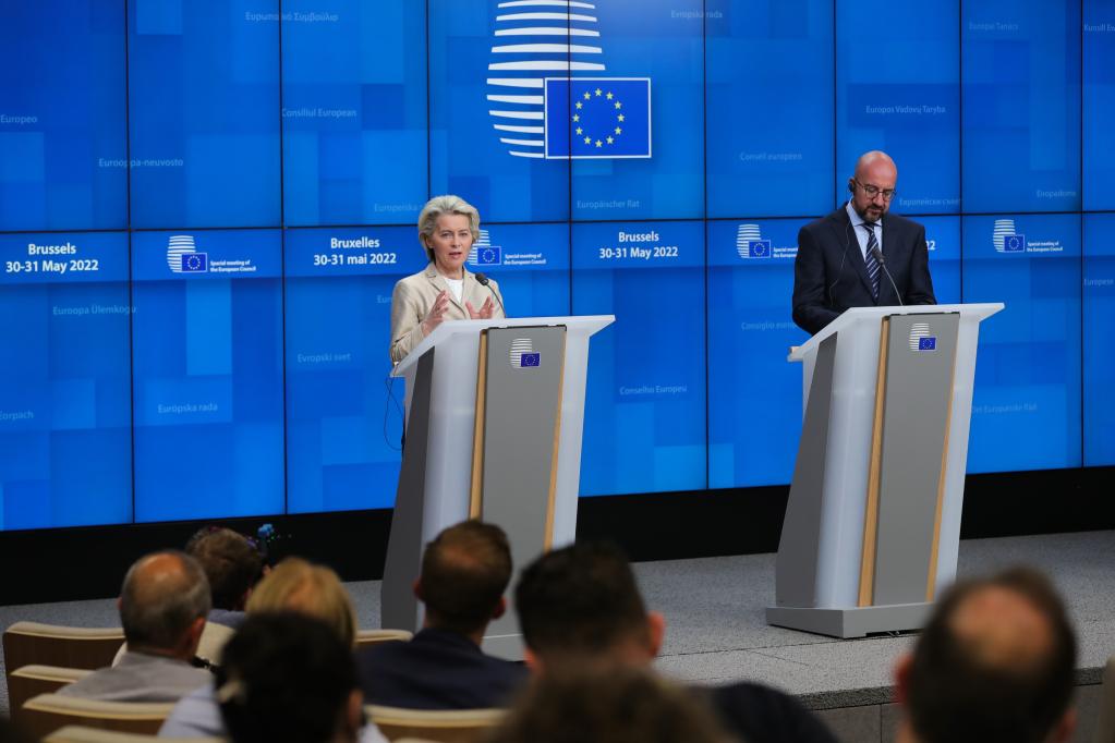5月31日,在比利时布鲁塞尔,欧盟委员会主席冯德莱恩(左)和欧洲理事会主席米歇尔在欧盟特别峰会后举行新闻发布会。(新华社记者郑焕松 摄)