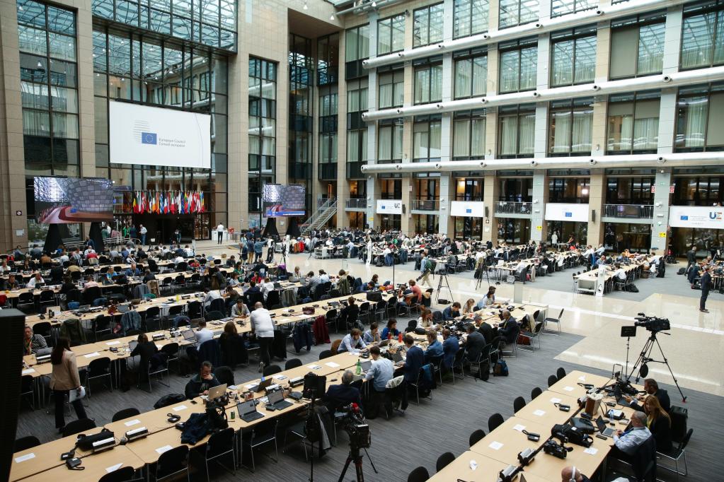 5月31日,记者在比利时布鲁塞尔的欧盟总部工作。为期两天的欧盟特别峰会5月31日结束。(新华社记者郑焕松 摄)
