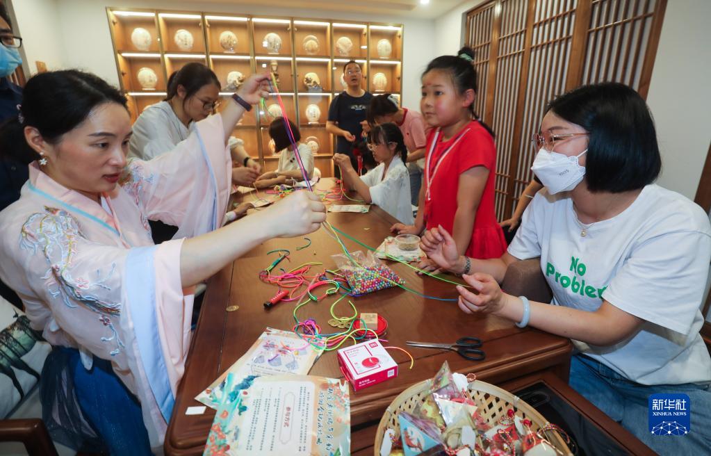 6月3日,游客在杭州市余杭区瓶窑老街的宋韵游园会上学做端午香囊、编五彩绳。
