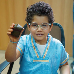 5月27日,在阿尔及利亚阿尔及尔,5岁的伊德里斯在中阿建设者子女共庆“六一”迎端午活动上体验“画额”。新华社发