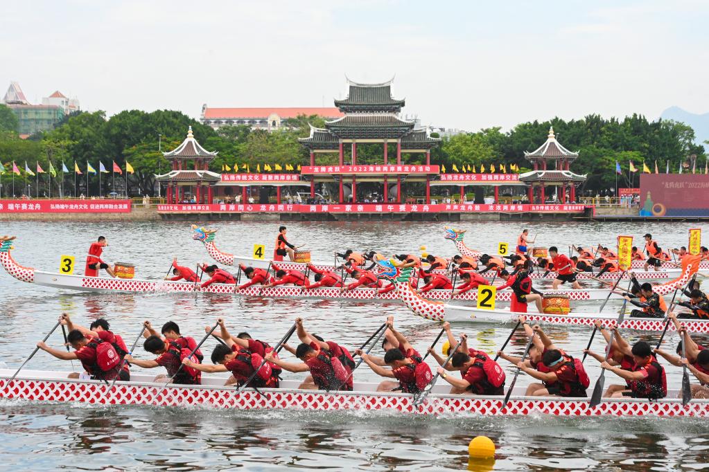 6月2日,在“龙腾虎跃”2022海峡两岸赛龙舟活动现场,参加龙舟比赛的龙舟队奋勇争先。新华社记者 周义 摄