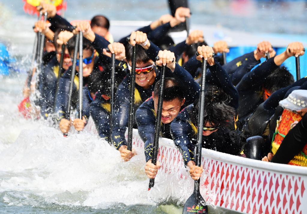 6月2日,在“龙腾虎跃”2022海峡两岸赛龙舟活动现场,来自集美学村体协队的队员在龙舟拔河比赛中奋力划桨。新华社记者 魏培全 摄