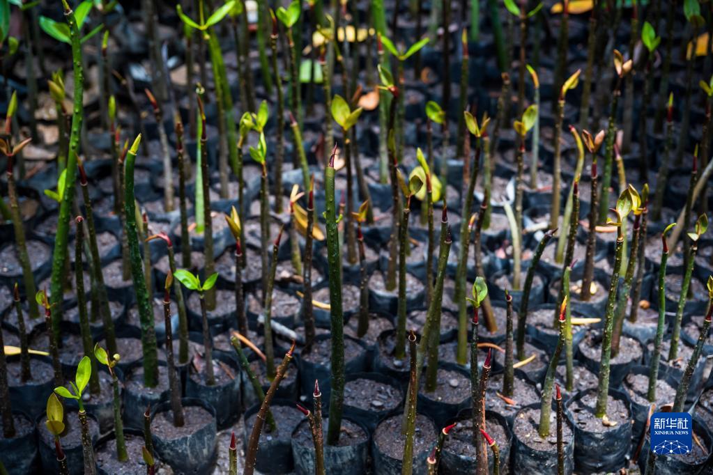 这是4月19日在马来西亚柔佛州丹绒比艾国家公园拍摄的红树树苗。为了保护红树林,丹绒比艾国家公园内建立起红树育苗基地,计划每年育苗1万株。