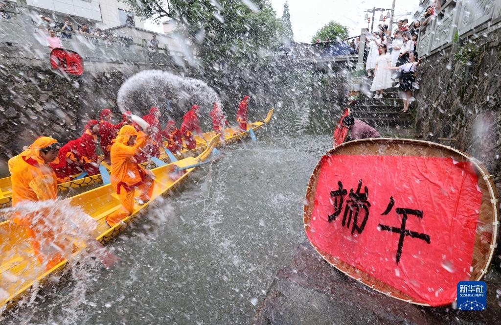 6月3日,在浙江省湖州市德清县下渚湖街道塘泾村,村民用船桨将河水泼向写有“端午”字样的蚕匾,祈求风调雨顺、国泰民安,龙舟泼水是塘泾村的传统习俗。
