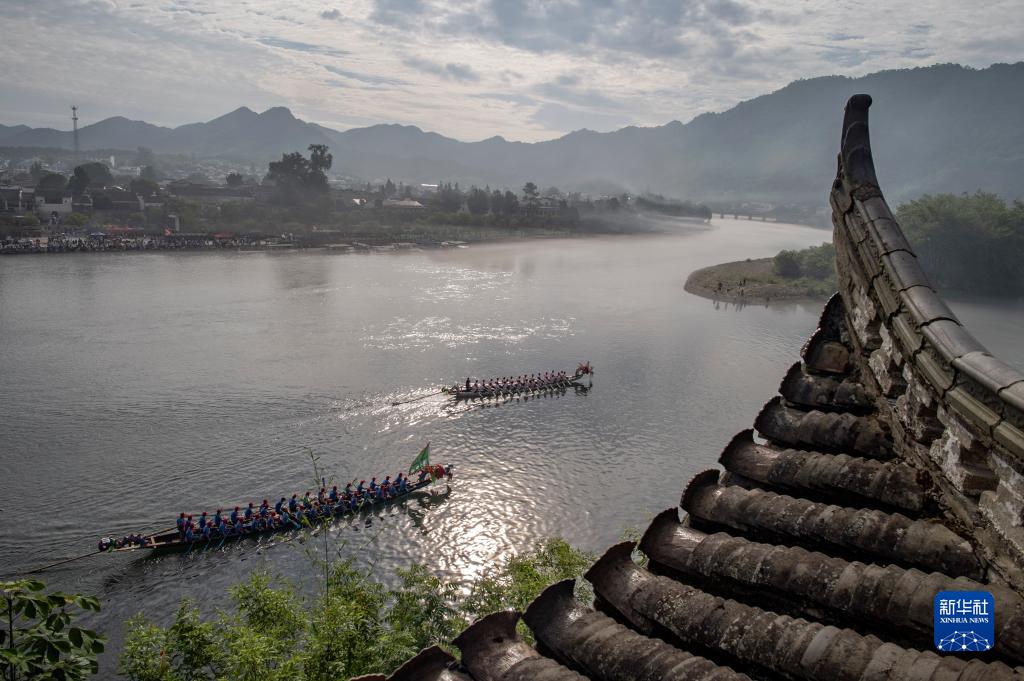 6月3日,在安徽省宣城市泾县桃花潭,人们划龙舟迎端午 。