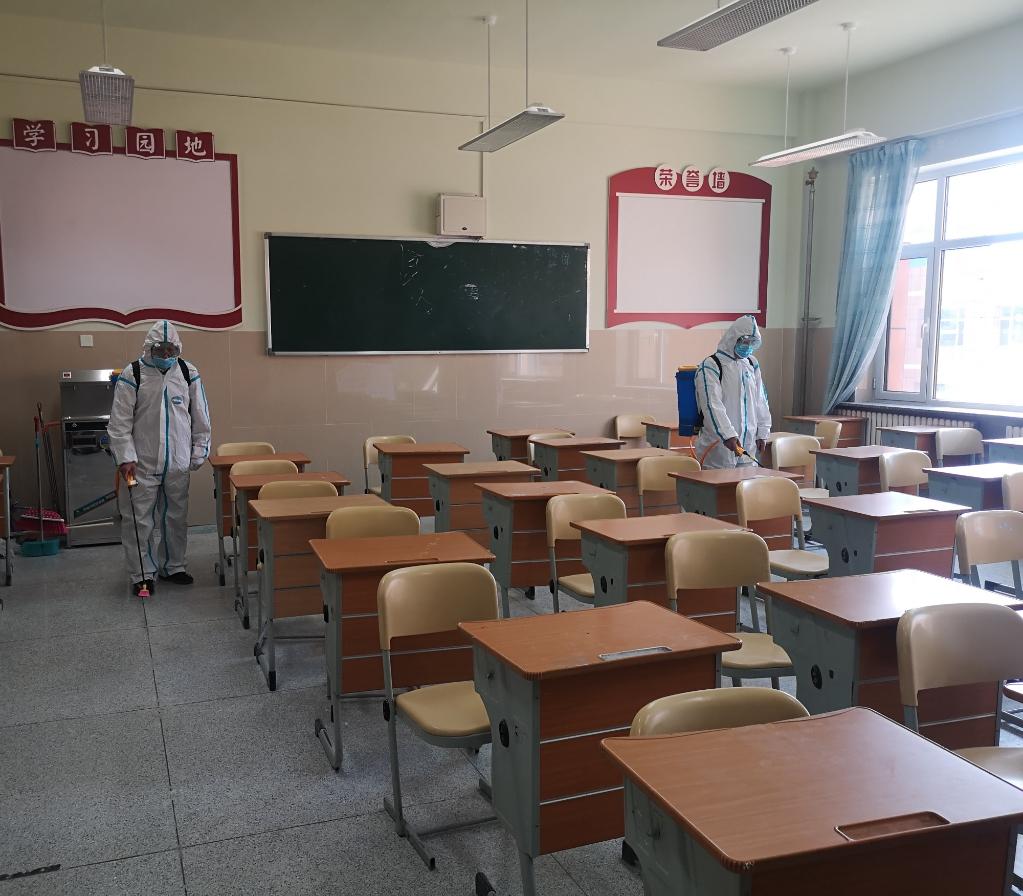 工作人员对长春二实验中学考场进行消杀。(受访对象供图)