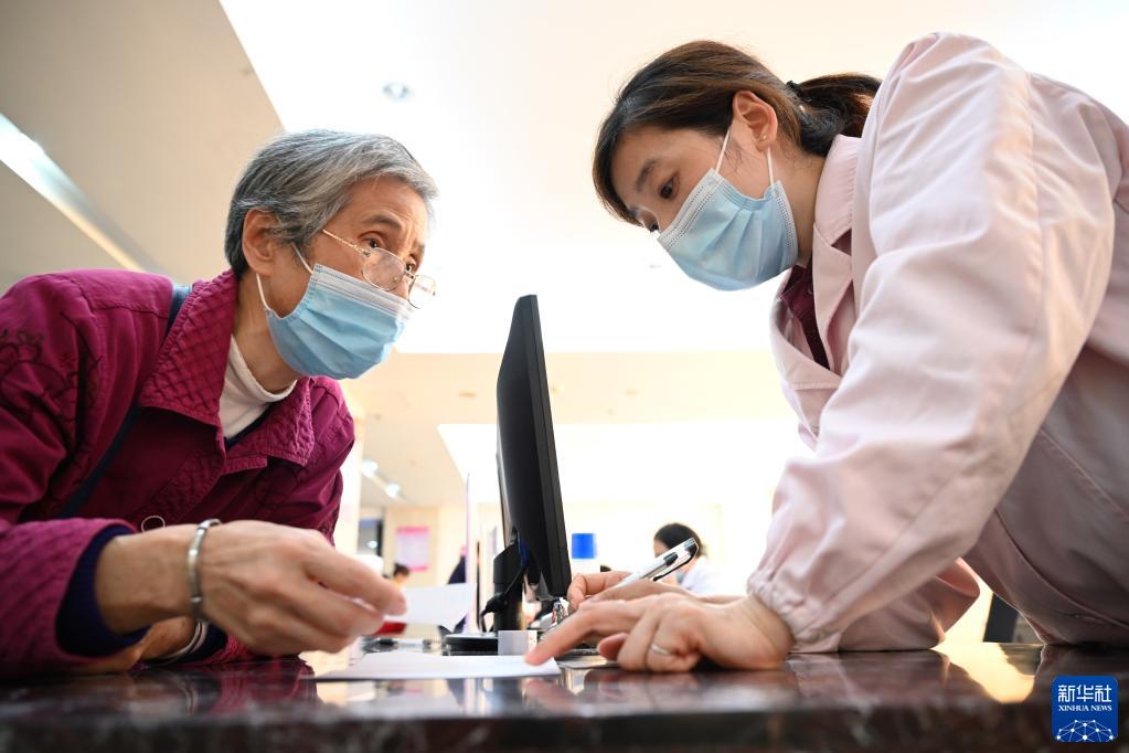 福建省三明市第一医院医保办工作人员(右)向前来咨询药品报销问题的居民讲解相关政策(2020年11月18日摄)。新华社记者 姜克红 摄