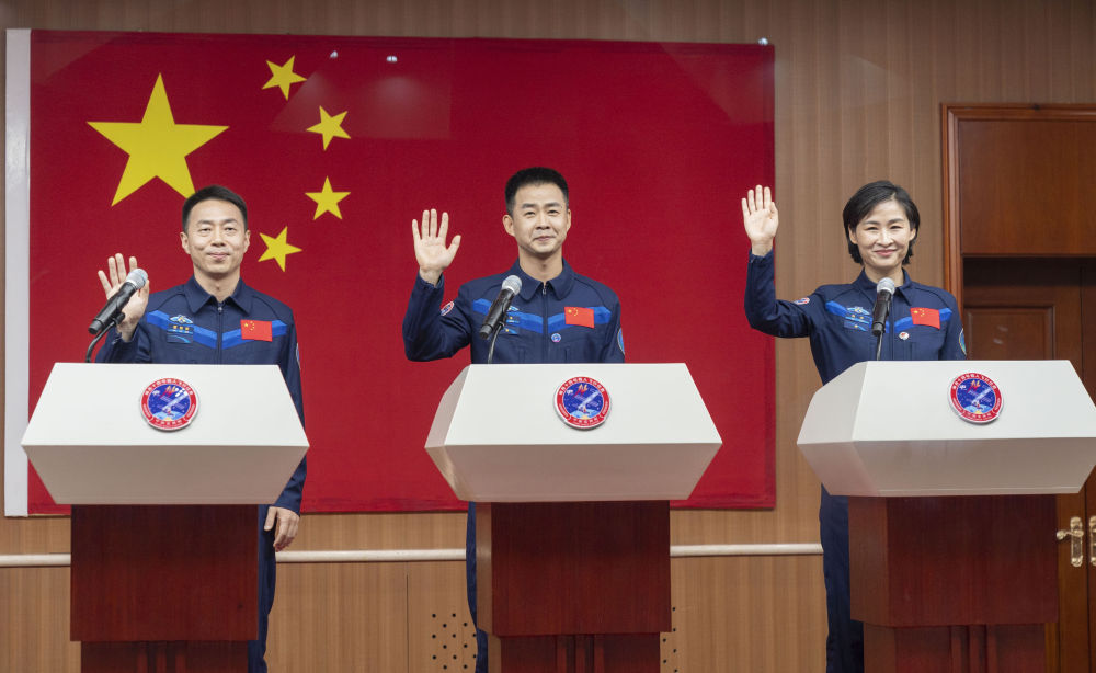 6月4日,执行神舟十四号载人飞行任务的3名乘组航天员陈冬(中)、刘洋(右)、蔡旭哲在酒泉卫星发射中心问天阁与媒体记者集体见面,并回答记者提问。