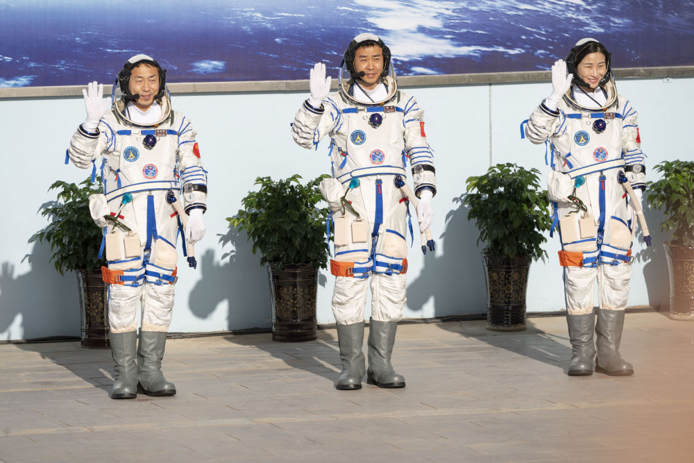 6月5日,神舟十四号载人飞行任务航天员乘组出征仪式在酒泉卫星发射中心问天阁广场举行。陈冬(中)、刘洋(右)、蔡旭哲即将开启为期6个月的飞行任务。