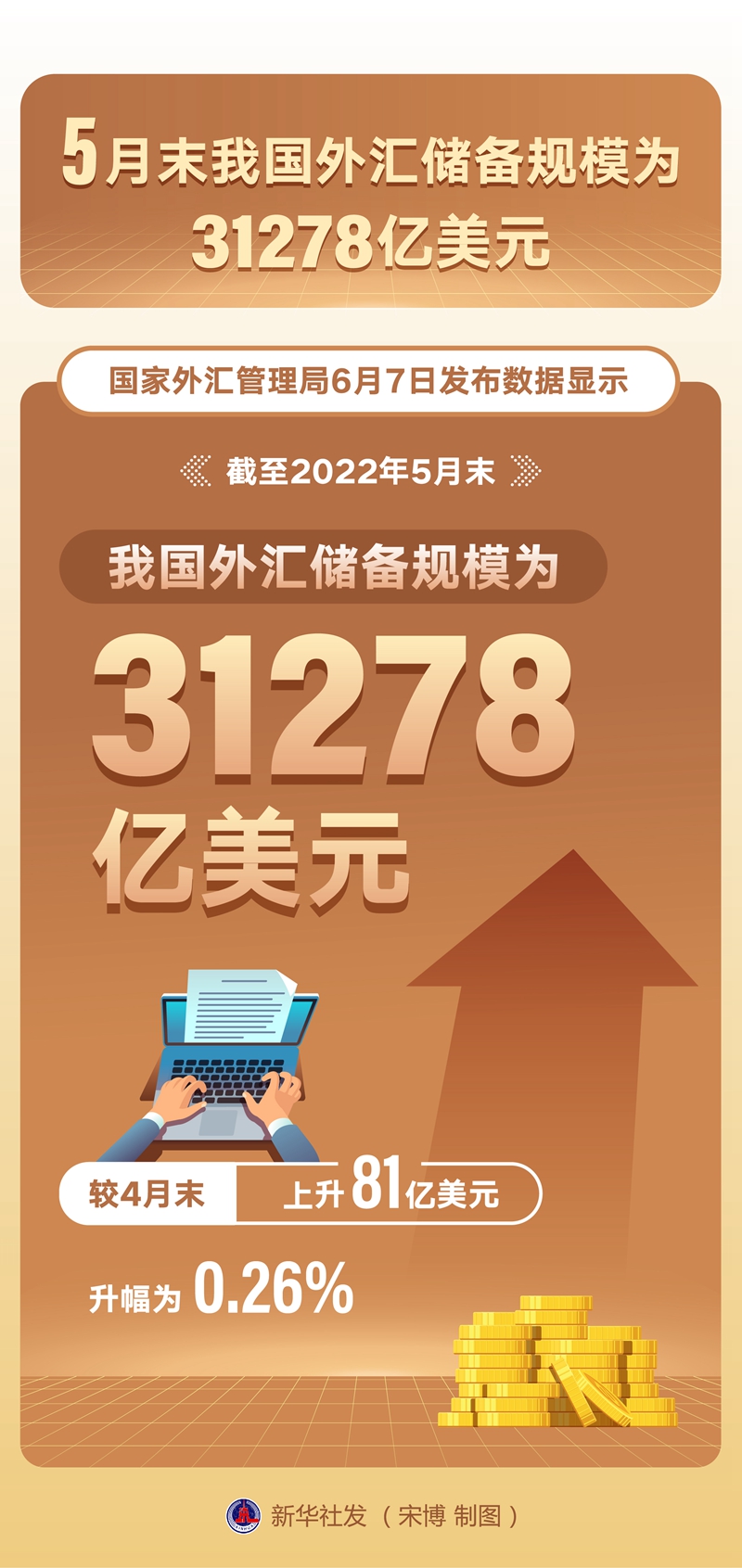 新华社北京6月7日电(记者 刘开雄)国家外汇管理局7日发布数据显示,截至2022年5月末,我国外汇储备规模为31278亿美元,较4月末上升81亿美元,升幅为0.26%。