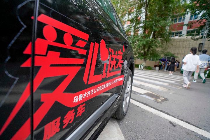 6月7日,在乌鲁木齐市第八中学考点,一辆由乌鲁木齐市交警支队等部门组织的“爱心送考”服务车准备待命。新华社记者 赵戈 摄