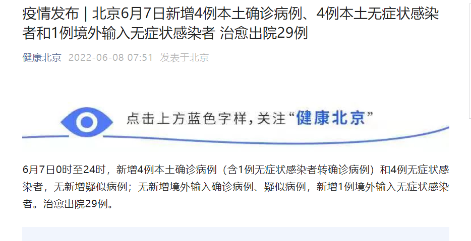 6月7日0时至24时,北京新增4例本土确诊病例(含1例无症状感染者转确诊病例)和4例无症状感染者,无新增疑似病例;无新增境外输入确诊病例、疑似病例,新增1例境外输入无症状感染者。治愈出院29例。