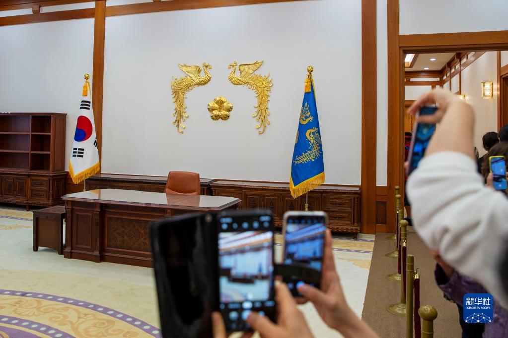 6月8日,在韩国首尔,游客参观并拍摄青瓦台本馆总统办公室。新华社记者 王益亮 摄