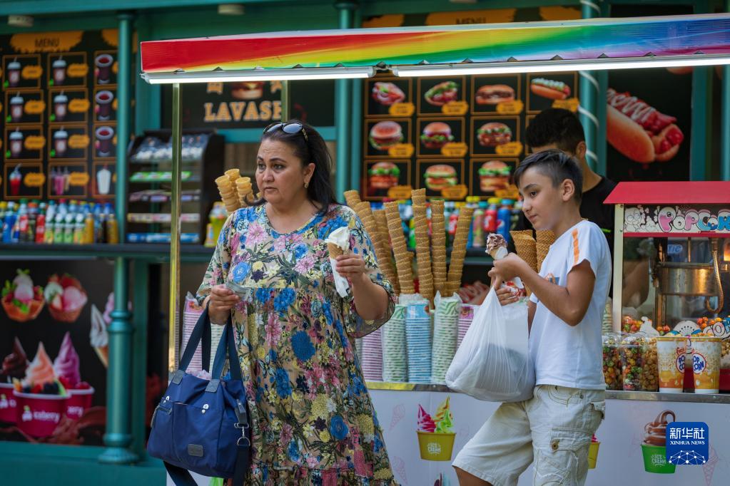 6月8日,市民在乌兹别克斯坦首都塔什干吃冰淇淋消暑。