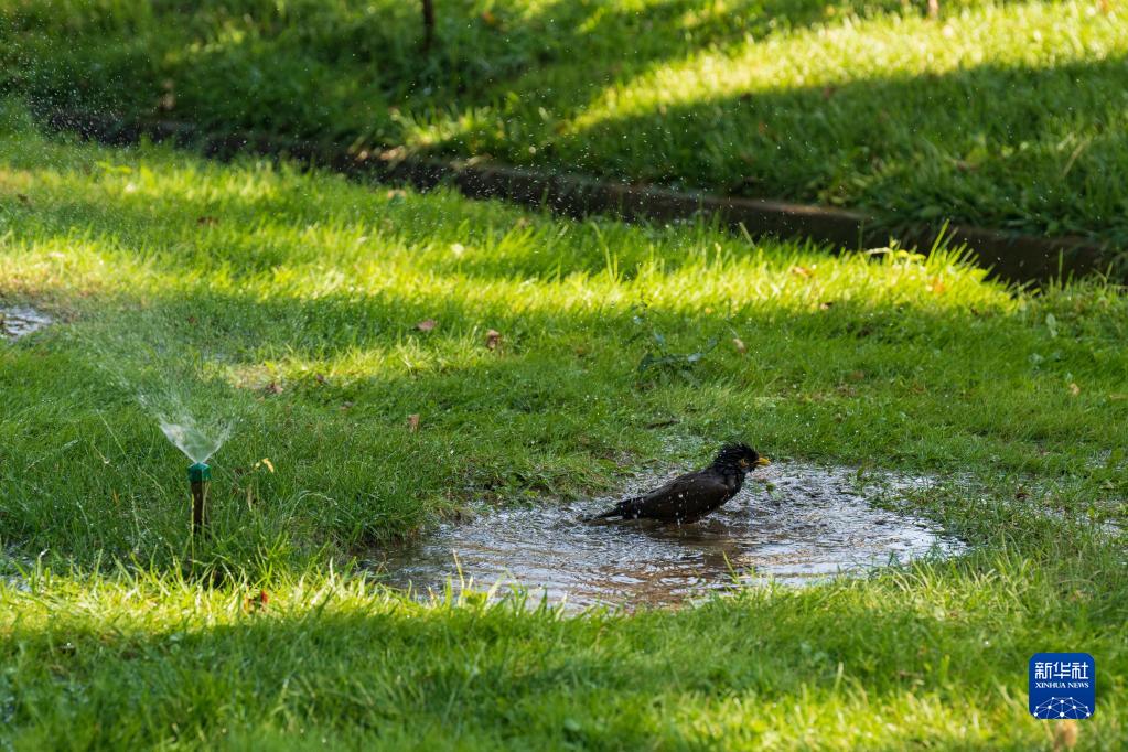 6月8日,在乌兹别克斯坦首都塔什干,一只小鸟戏水纳凉。