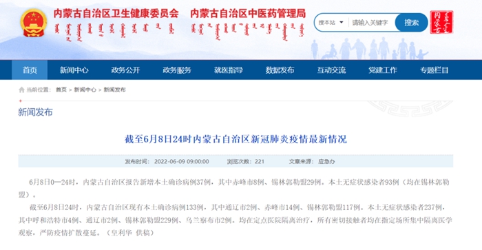 6月8日0—24时,内蒙古自治区报告新增本土确诊病例37例,其中赤峰市8例、锡林郭勒盟29例。本土无症状感染者93例(均在锡林郭勒盟)。