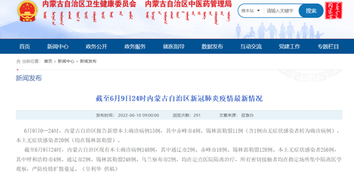 截至6月9日24时,内蒙古自治区现有本土确诊病例148例,其中通辽市2例、赤峰市18例、锡林郭勒盟128例。本土无症状感染者256例,其中呼和浩特市4例、通辽市2例、锡林郭勒盟248例、乌兰察布市2例。均在定点医院隔离治疗,所有密切接触者均在指定场所集中隔离医学观察,严防疫情扩散蔓延。