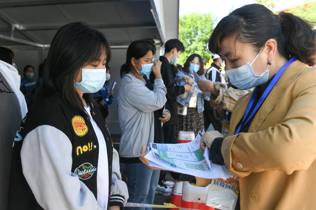 6月7日,在内蒙古赤峰市松山区第四中学考点,工作人员在检查考生健康码及核酸检测报告。(新华社记者 贝赫 摄)