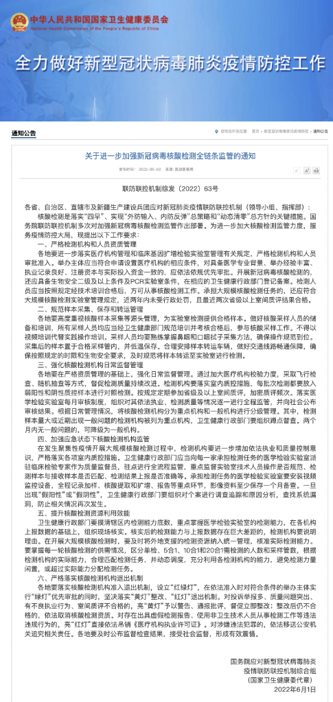 国家卫生健康委医政医管局监察专员郭燕红在发布会上表示,近期,国务院联防联控机制综合组从严格检测机构和人员资质管理、强化核酸检测机构日常监管、加强应急状态下核酸检测机构监管等方面加大新冠病毒核酸检测全链条监管力度。