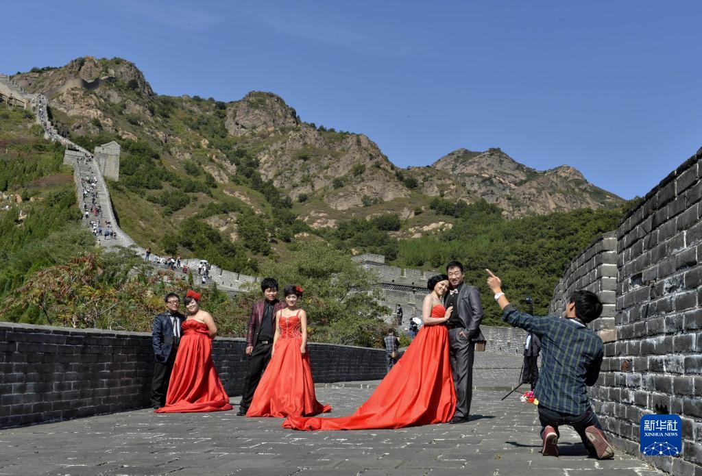 新人在山海关角山长城拍照(2012年10月5日摄)。 新华社记者杨世尧 摄