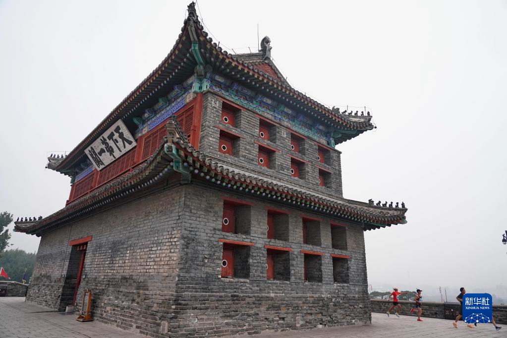 运动员参加2019秦皇岛天下第一关·长城国际马拉松比赛时经过天下第一关城楼(2019年10月20日摄)。 新华社记者杨世尧 摄