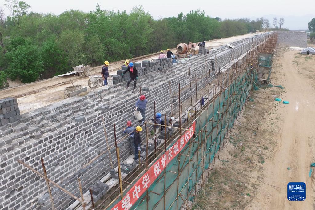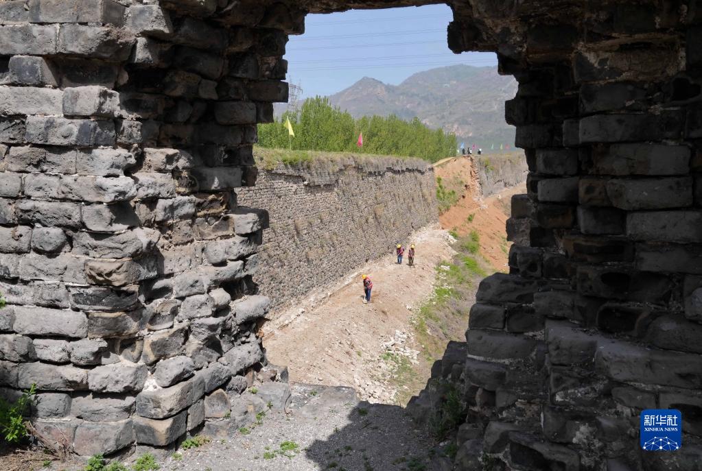 4月26日,工人在山海关长城北翼城修缮工程工地施工。 新华社记者杨世尧 摄