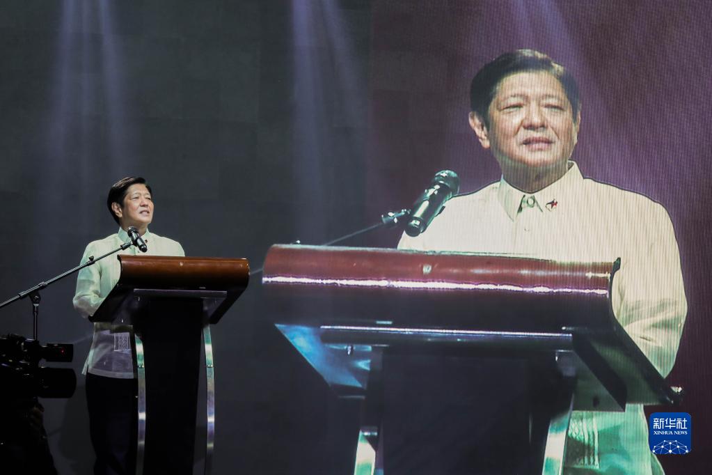 6月10日,菲律宾当选总统费迪南德·罗慕尔德兹·马科斯在马卡蒂出席第二届“中菲相知奖”颁奖典礼时发表讲话。新华社发(乌马利 摄)
