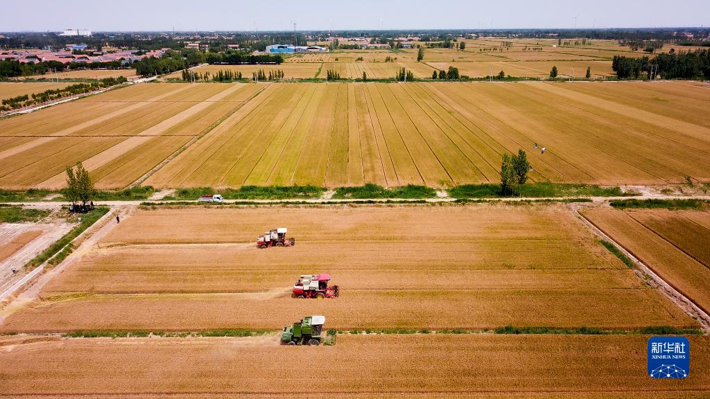 6月7日,在山东省惠民县桑落墅镇,农民驾驶农机收获小麦(无人机照片)。新华社记者 郭绪雷 摄
