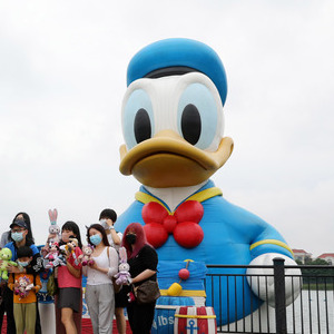 6月10日,游客在上海迪士尼度假区内的星愿湖边与唐老鸭造型的充气玩偶合影。新华社记者 方喆 摄