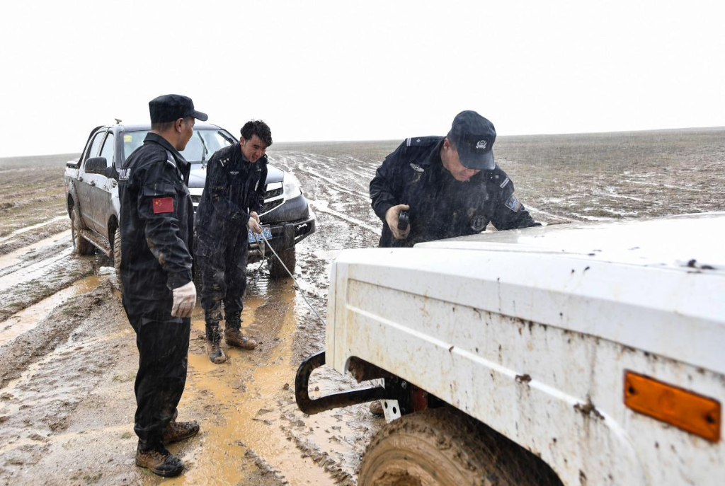 巡山队员在可可西里地区冒雨拉车。新华社记者 张龙 摄
