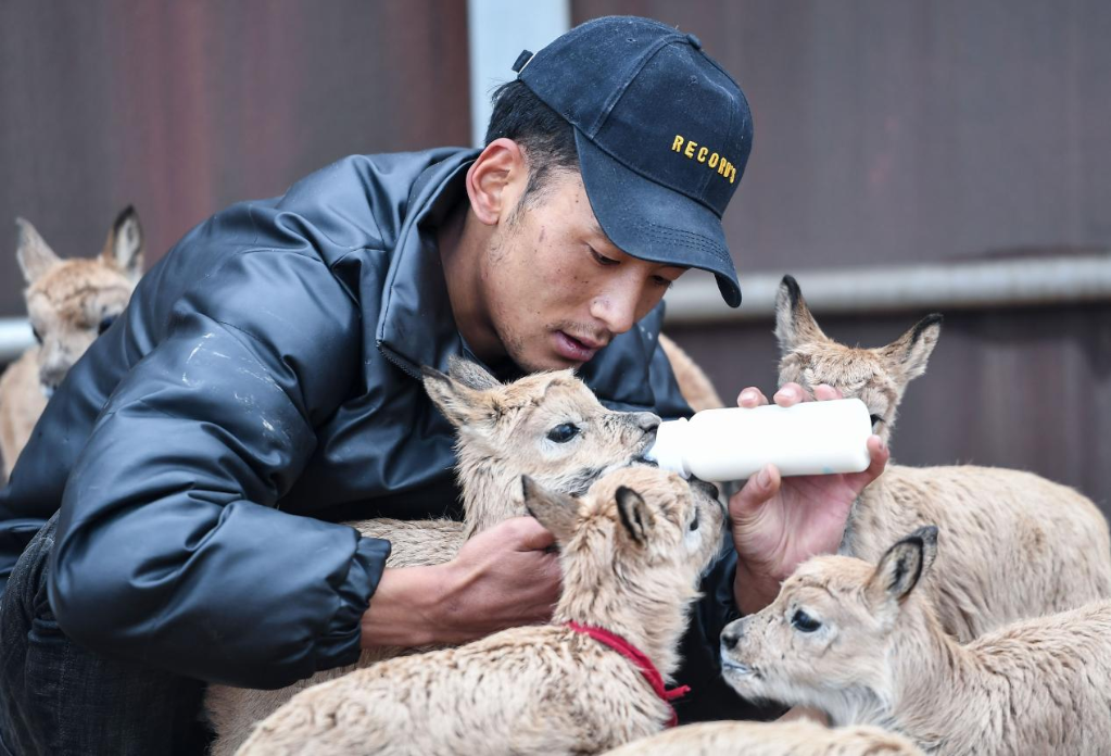 可可西里国家级自然保护区卓乃湖保护站的工作人员给藏羚羊幼仔喂奶。新华社记者 薛玉斌 摄