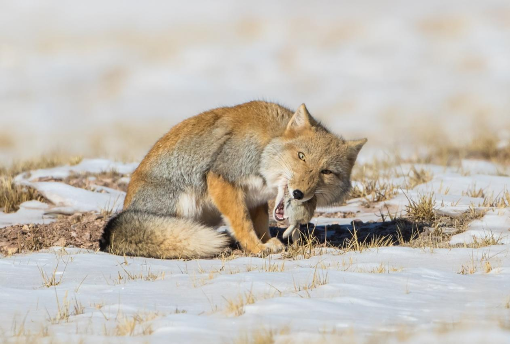 一只藏狐在可可西里五道梁附近捕食猎物。新华社发(孙洪 摄)