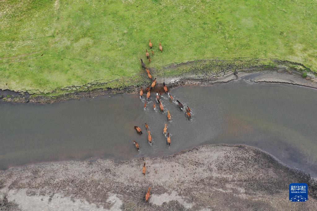 这是6月10日拍摄的经过莫尔格勒河的马群(无人机照片)。