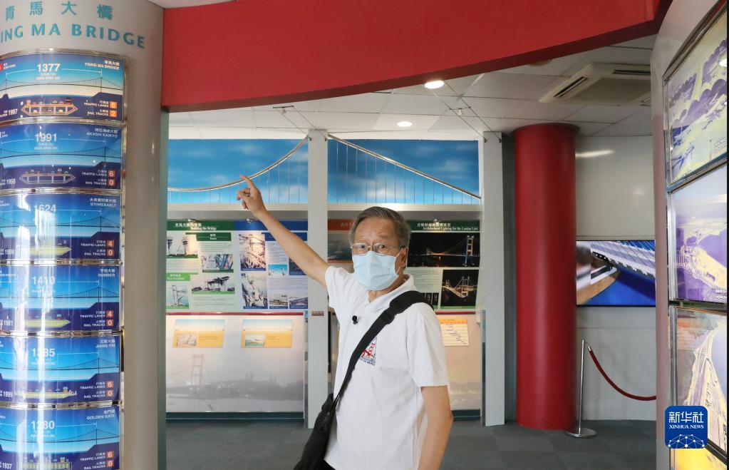 5月30日,刘正光在青衣岛上的展室向新华社记者介绍青马大桥。新华社记者 吴晓初 摄